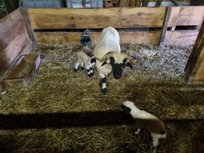 ……in der alten Käserei. Unsere Sunny hat gesunde Zwillinge zur Welt gebracht. Es sind 1 Bock und 1 Auenlamm. Hat jemand Namensvorschläge?